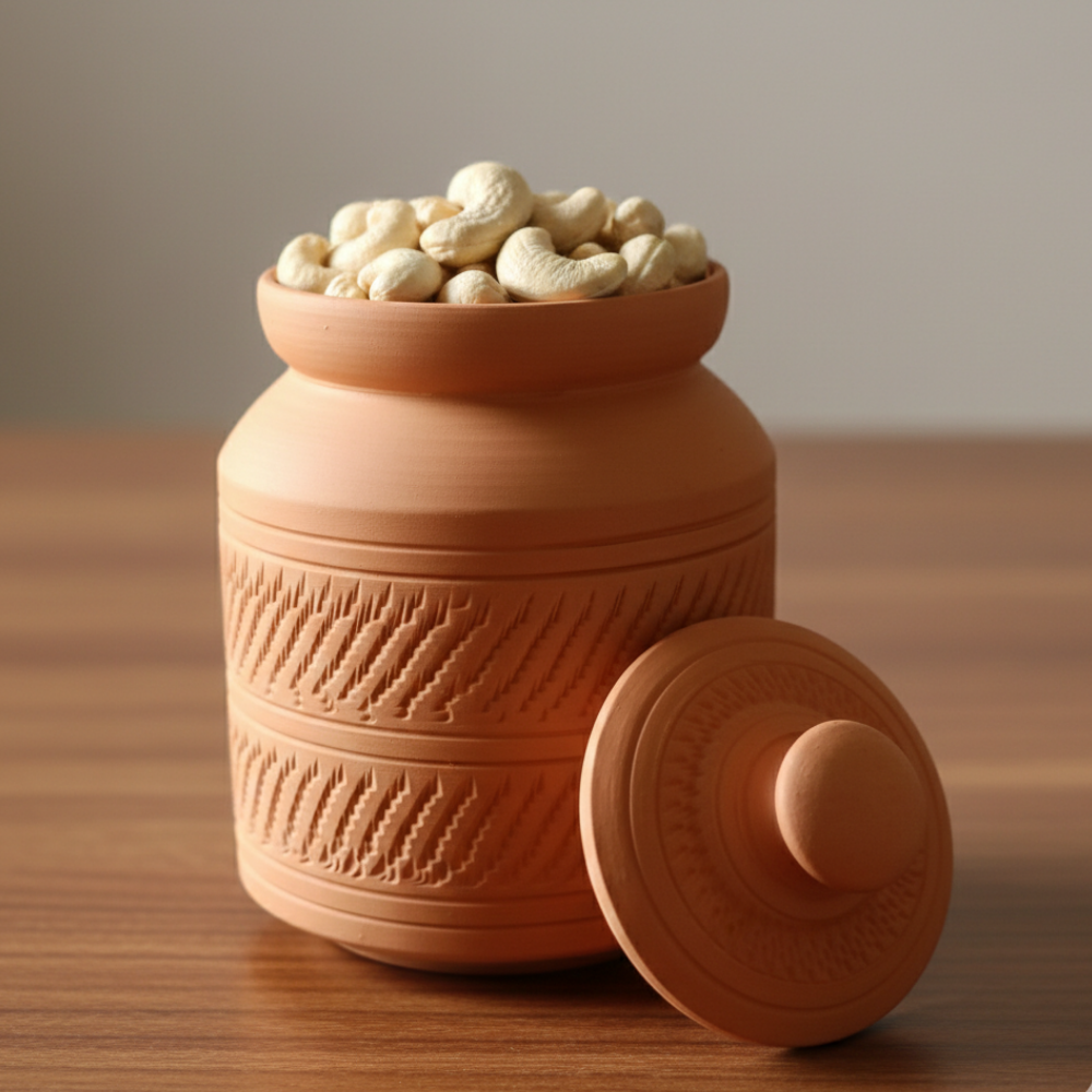 Crafted using the traditional rouletted ware patterns, this clay jar embodies artisanal excellence and versatility. Its textured surface showcases intricate geometric patterns created through skilled hand-pressing, making each piece distinctly unique. Perfect for storing dry fruits and spices while maintaining their freshness, this jar doubles as striking home décor that adds warmth to any space. Display it as a vase for fresh or dried flowers, or commission a personalized Surahi for special occasions. Crafted from natural clay, it brings authentic heritage craftsmanship into your home.